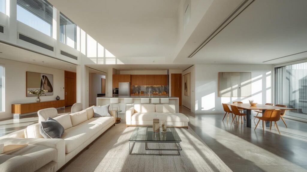 High ceilings, large windows, and minimalist furniture further enhance the feeling of openness. The visual continuity between spaces allows the eye to travel freely, making the home feel less confined.